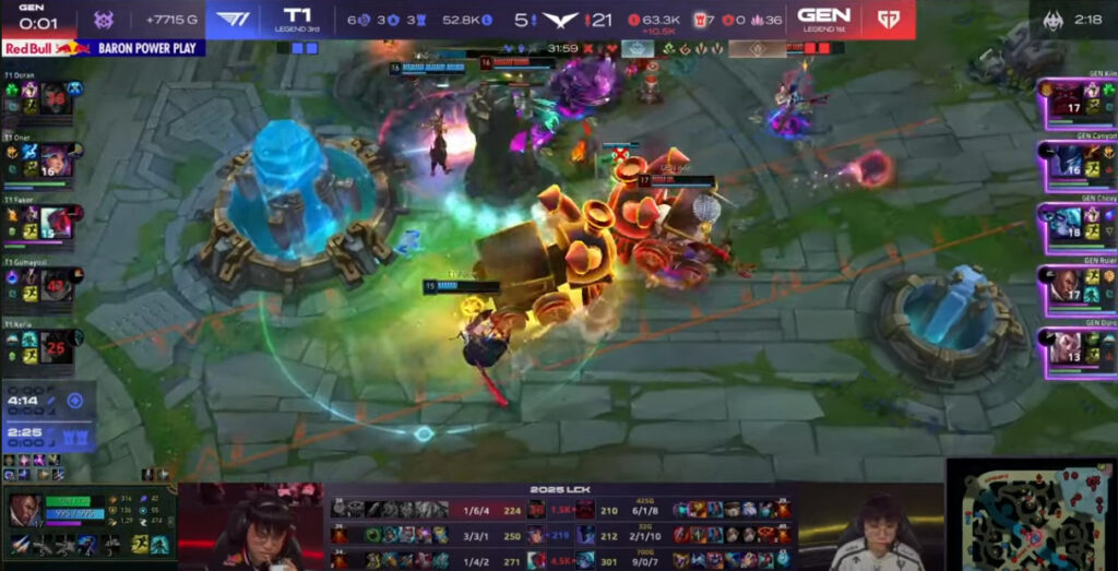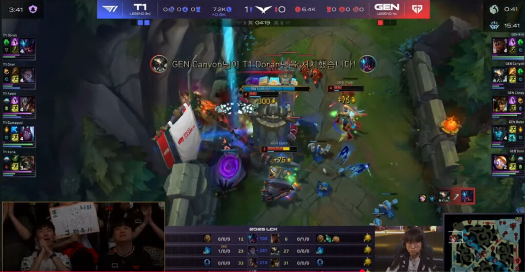 4分19秒経過時点、T1のTOPレーンでTOPのレクサイ一人に対してGen.G側のADC・SUP・JGによるタワーダイブが成功し1ファーストブラッド。