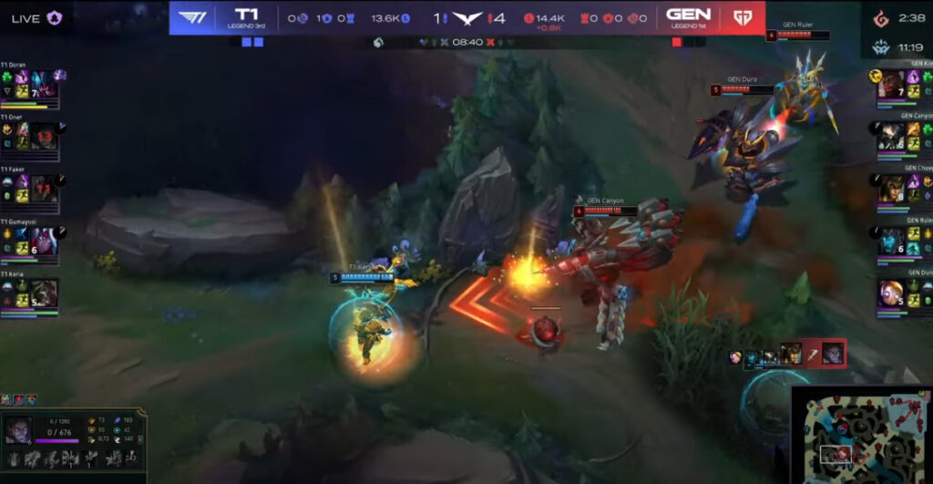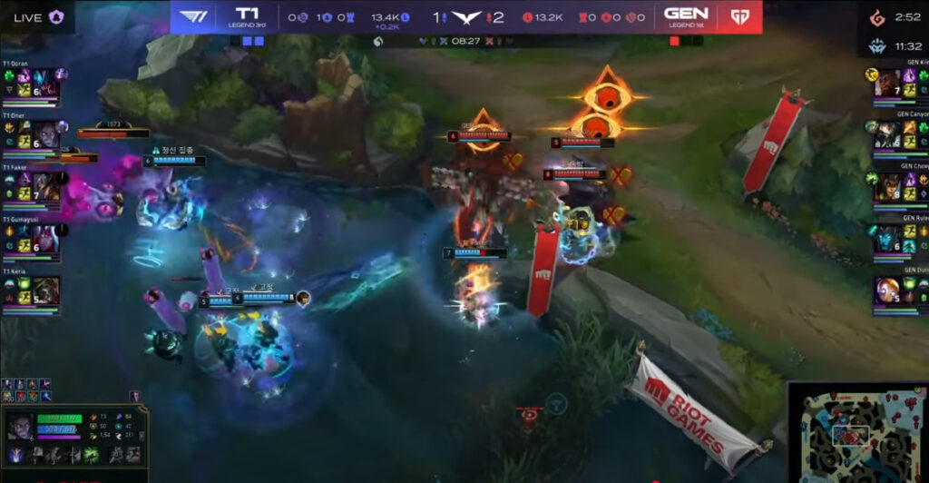 最初に大きく流れを変えたのは8分26秒、ヴォイドグラブ争奪戦のこのシーン。Gen.G側はカリスタがTOP側に少し離れていたためFakerがTFのRでリバー近辺でカシオペア・ブリッツ・スカーナーの3人に対してエンゲージ。それに被せる形でヴァルスのRも飛んでいます。局地的で短い時間ではあるものの4v3の状況となっており、ここでしっかり1キル以上落とせていれば仮にカリスタが合流しても数的優位となり、またダメージソースは基本的にカシオペアとカリスタに寄っている構成のため、ここで仮にカシオペアを落とせていたら集団戦は完全に優位となる流れ。
