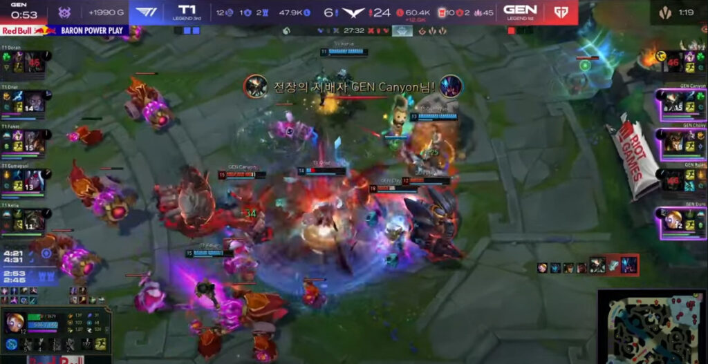 序中盤で入るべきキルがキャリー陣にしっかり入ったGen.Gはこうなるともうつけ入る隙がありません。もともと、タンクが多い構成は試合の流れが五分以上になると、不確定要素、突発的なデスによるゴールド差の巻き返しやオブジェクト奪取といった事故が非常に発生しづらい構成です。続く3ドラ、アタカン、そしてバロンとほぼ全てのオブジェクトをGen.G側が抑え、しかもキルカウント24-6と圧倒的な大差でこの4ゲーム目を決める展開となりました。