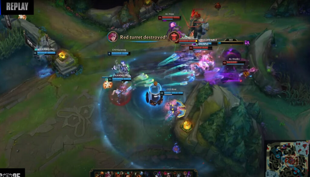 アタカン前のこのシーンとかもそう。「おぉ!?」と思う一瞬ではあったのですが、どうしてもMFのRは瞬間火力になってしまうため、ハマれば一瞬で全てを決してくれるのですが、ALクラスの相手の場合はなかなかそうもいかず、Rを上手く捌かれてしまうとその後、CFO側に武器が乏しく結局MFのR後のDPS勝負で負けてしまう展開に見えました。ルブランやレクサイといったブリンクチャンプが敵に多かったのも苦しさの一因だったように思います。