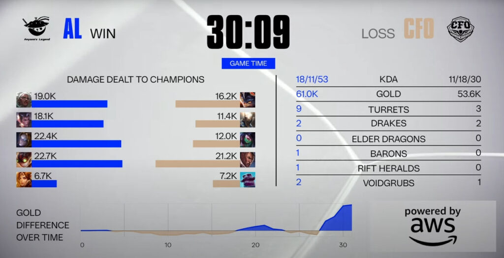 このまま2戦目も獲るか?と思って見ていましたが、2戦目は上図の通りALの勝利。スコアだけ見るとMIDでアカリが上手くワーク仕切れなかった印象。Doggoは相変わらず存在感を放っていましたがMID&JGのコンビがダメージ面でもCCやゾーニングといったサポート面でも仕事をさせてもらえてなかった感じ。