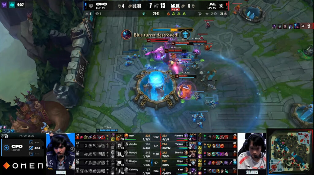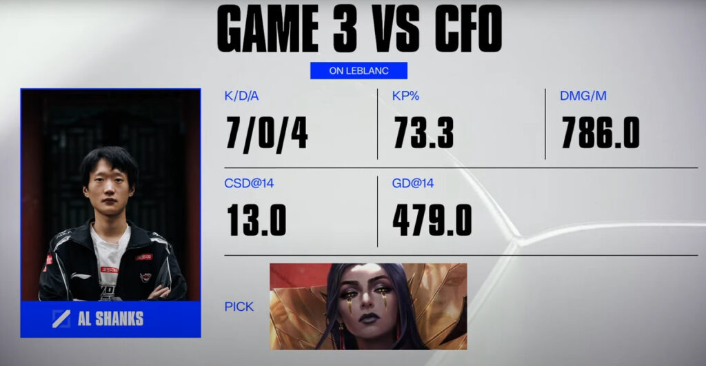 CFOのMID、HongQのタリヤに対してALのMID、Shanksが出したルブランがしっかり刺さってゲーム全体を支配している感じでした。機動力もあり、CCもあるため一度流れが傾いてしまうと厳しい展開になります。