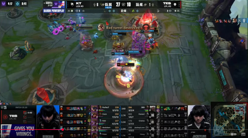 スイスステージ3日目、3-0で全勝優勝をいち早く達成したのはKTとAL、中でも先にストレートで勝敗を決めたのは上図の通りKTでした。ちなみに今回のWorlds公式放送、試合直後のリザルト画面が出る場合と出ない場合があるため、同じ形式で全ゲーム上げられないのが残念なところ。上図は1ゲーム目の終盤です。