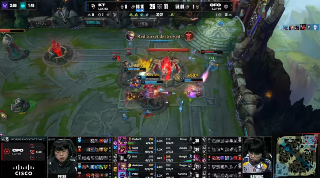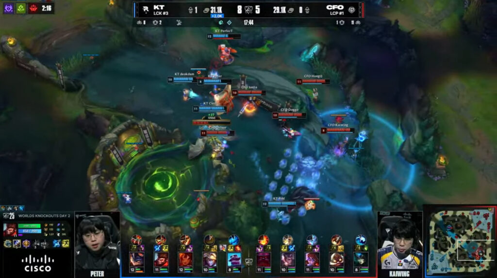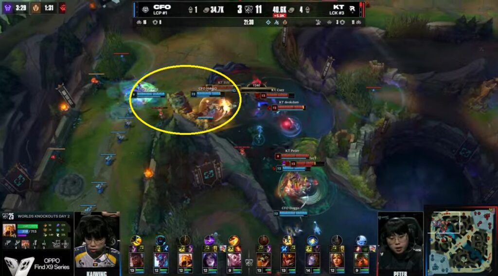 ただ、CFOとしてはどうにかキルを集めたいADCのDoggoが0キルでお金が入らず、他方KTはキャリーラインのゾーイに3キル、ジグスにも3キルと6キル全てが良い形でキャリー陣に集まった点がこの後の展開を分ける要因となります。