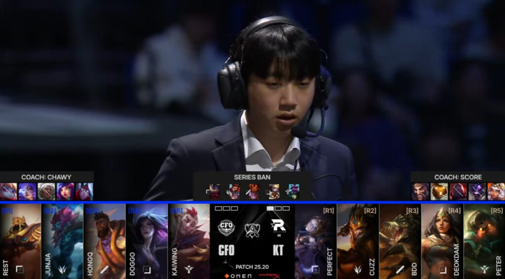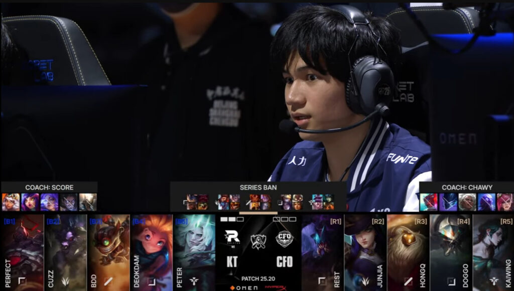 GAME3のバンピックは上図のような感じ。ブルーサイドのKTが1stピックでサイオンを押さえ、対するCFOはレクサイを返します。ラストピックはCFOがMIDのフェイをゾーイに当てる形でバンピックを終えます。