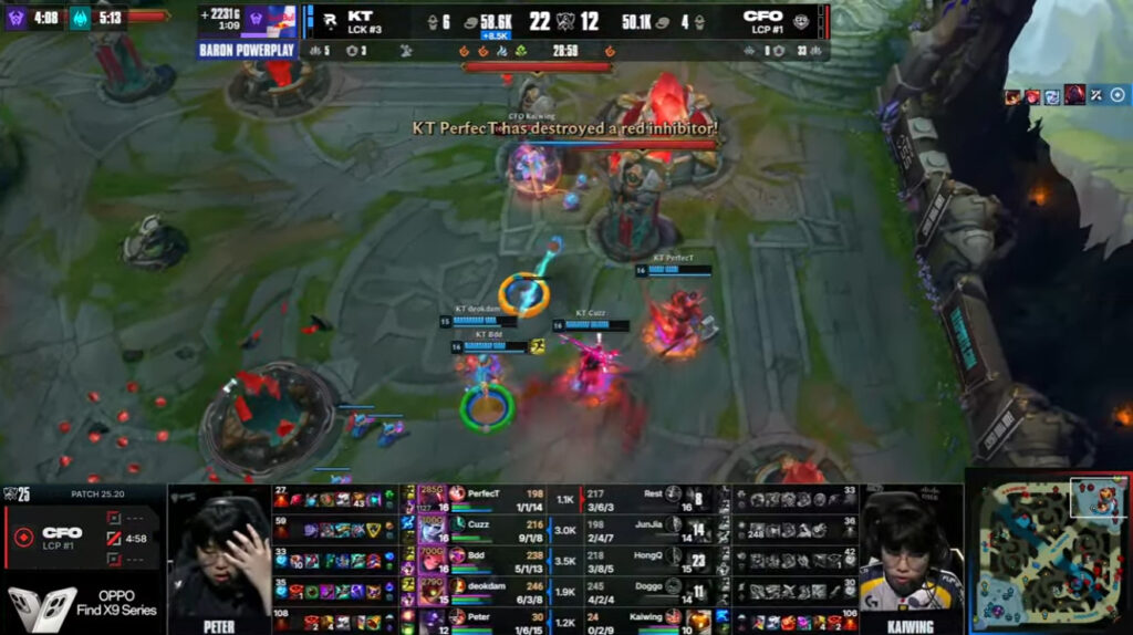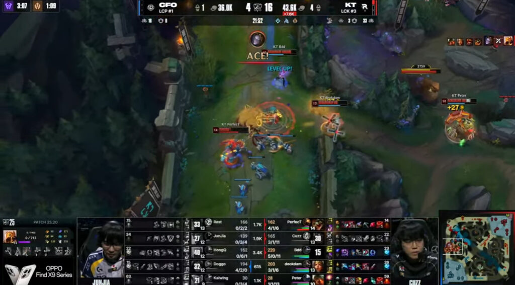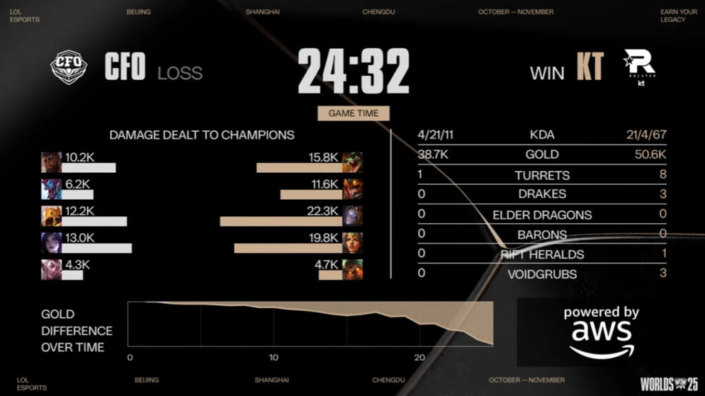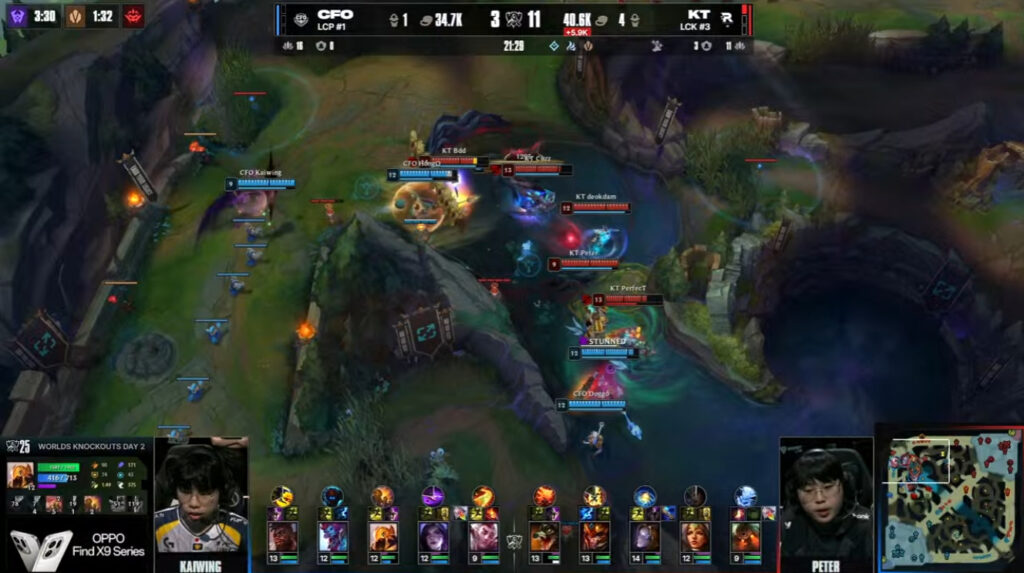 その後ゲームは32分まで続きますが、ゴールド差12K、オブジェクトもほぼKTが獲得する形で完勝。ここまで大躍進が続いたCFOですがLCKの上位チームが本気で挑むBO5にこれまでと違う圧を感じていたように見えます。