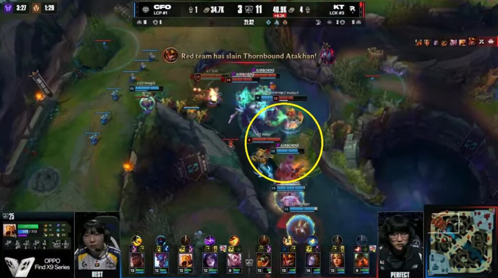 双方、思惑を持ってのバンピックだったと思いますが全体的な練度でKTは常に一歩上を行っていた印象。特にこの17分の3ドラ目を争ったシーンですがドラゴンを触るCFOのバックラインからタリヤが圧をかけつつフロントラインはドラゴンと戦闘中のシンジャオを囲み込む形。下がるに下がれないCFO陣営はドラゴンこそ獲得できたもののここで3-0のキルトレードを食らって大きくゴールド差を拡げてしまいます。
