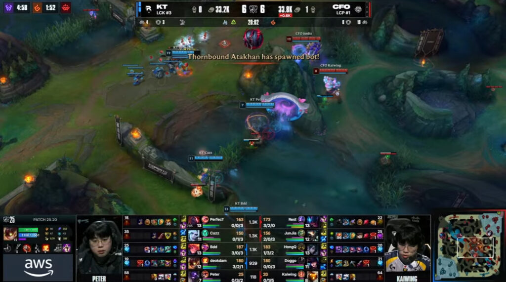 このGAME2も終始KT優勢のペースで試合は進行します。象徴的だったのはこの21分のアタカン前の戦闘シーン。