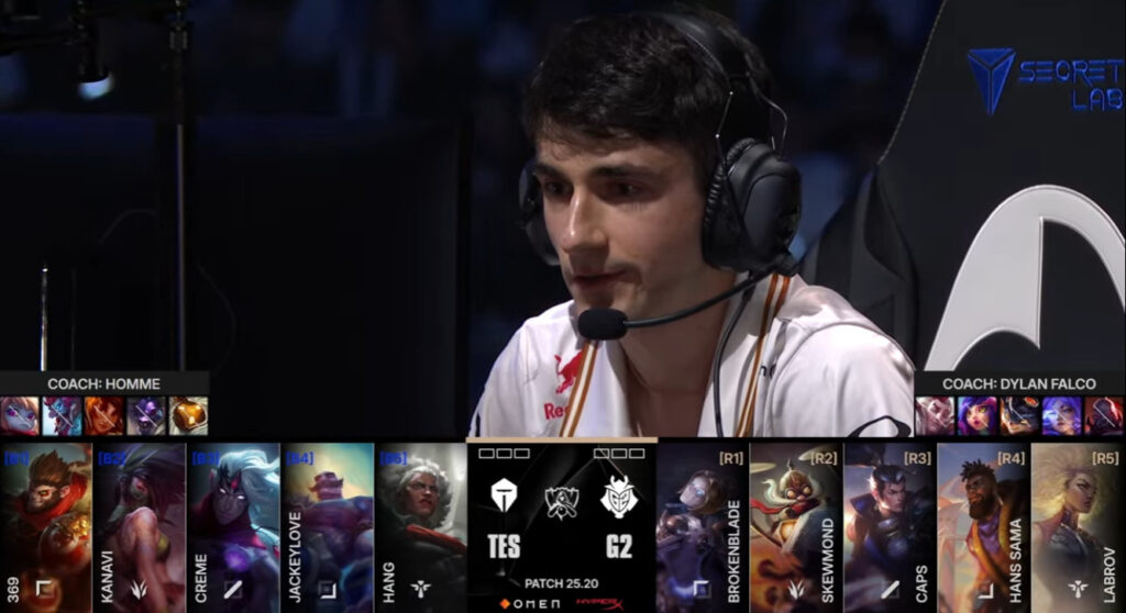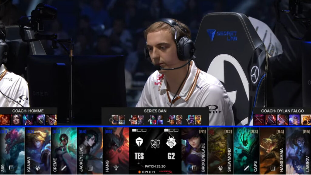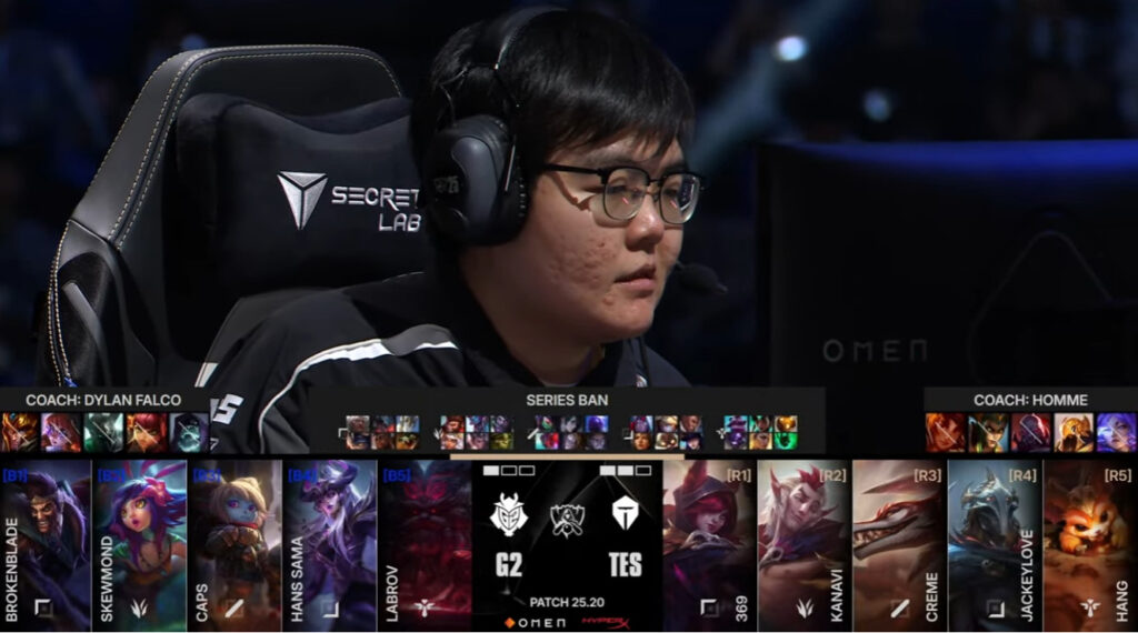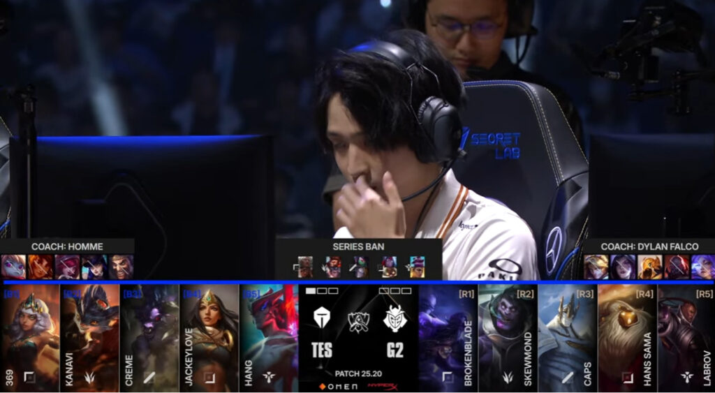 GAME1はブルーサイドTESの1stピックがウーコンJGのピックで始まり、返す形でG2がMIDオリアナを選択。その後G2はJGにオリアナと相性の良いシンジャオを選択し、ラストピックはSUPのレルで締める形でバンピックを終えました。