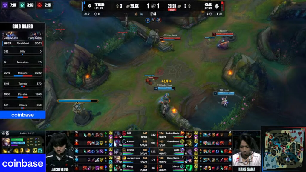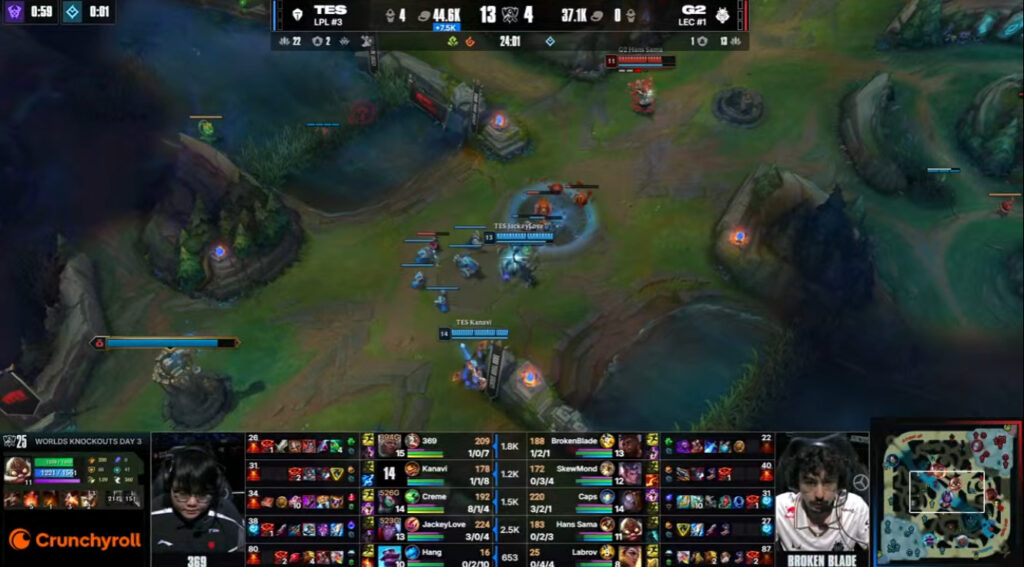 試合が始まると双方共にキルがあまり入らない展開。ゴールド的にもキルカウント的にも拮抗した展開。タワー数も17分時点だとイーブンです。オブジェクトもTES側が2ドラを先行しているのに対してG2はヴォイドグラブ3匹とヘラルドを押さえており、こちらも五分の展開と言えそうです。