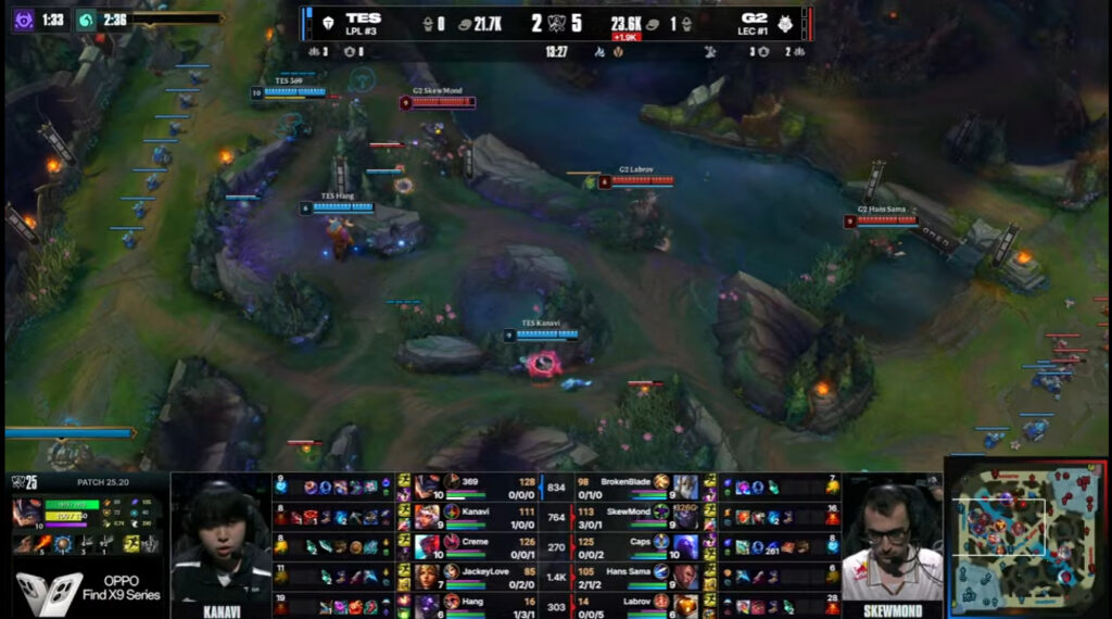 いずれのチームもフロントはタンク&ファイターが潤沢で後衛のADCはポークタイプ。TES側はMIDのアカリやTOPのアンベッサでアサシンを狙える構成であるのに対してG2側はMIDオリアナで戦場のコントロール力を重視した構成。