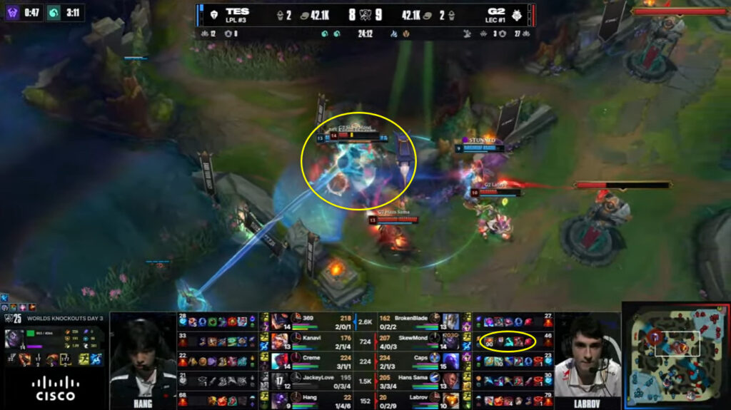 ↑その後、試合は進展して上図は24分時点。4-0-3で2コア半の装備が入ったムンドは三人からフォーカスを受けても落ちません。絶対的に強固な壁をフロントに据えてG2のADC Hans Samaのルシアンもキルを積み上げていきます。