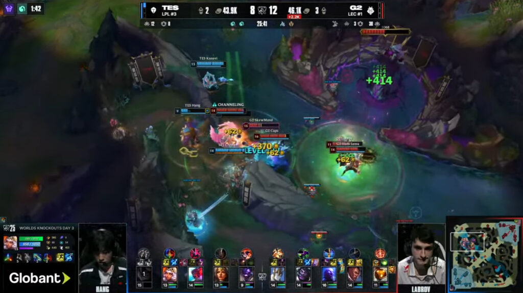 結局アタカンを奪われた後、0-3のキルトレードで人数差が出来てしまったG2はそのままドラゴンも落とします。元々かなり拮抗した展開だっただけに、獲得するとレベル差が産まれるアタカンを落としたダメージは大きく、戦闘でTES側に入ったゴールド、さらにはこのドラゴン分の有利なども合わせると同じ当たり方をするともう勝てない、といった差がついてしまったように思います。