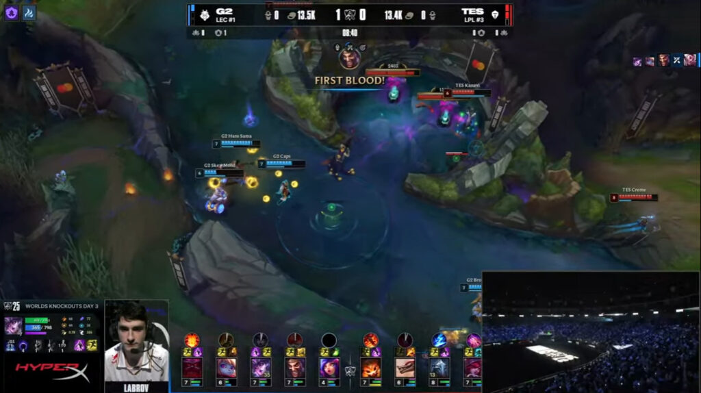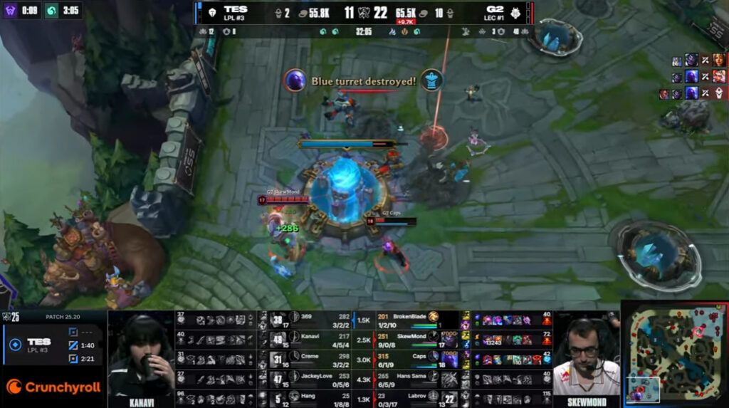 そこから先はほぼ詰め将棋。バロンバフと大きくスケーリングしたムンドを軸にTES陣営へのシージが着々と進み最終的には32分でキルカウント22-11、ゴールド差10KでG2がGAME2の勝利を納めます。