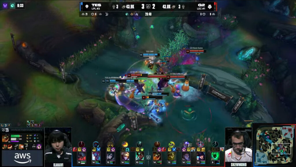 試合が進行する中で感じたのは「G2がTESを捉えるにはCCが足りなさそう」ということ。ブリンクや煙幕を持つアカリ、縦横無尽に動き回るアンベッサ、分身とブリンクを持つウーコン、といった感じでTES側のチャンプは単一CCだと捉えるのが難しいチャンプが多く確定CCを持たないG2の構成だと落とし切る流れに持っていけません。他方、TES側はバースト火力の高いアカリを筆頭にG2のSUPであるレルやJGのシンジャオを確実に落としていきます。