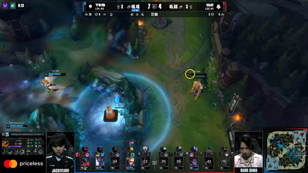 ↑GAME2は開始序盤から試合が動きます。3分台ではJGムンドが体の強さを活かしてタワーダイブを試みるなど積極的に動き13分経過した時点でキルカウント5-2。ゴールドで2KほどG2側が上回ります。