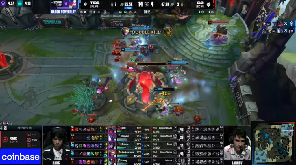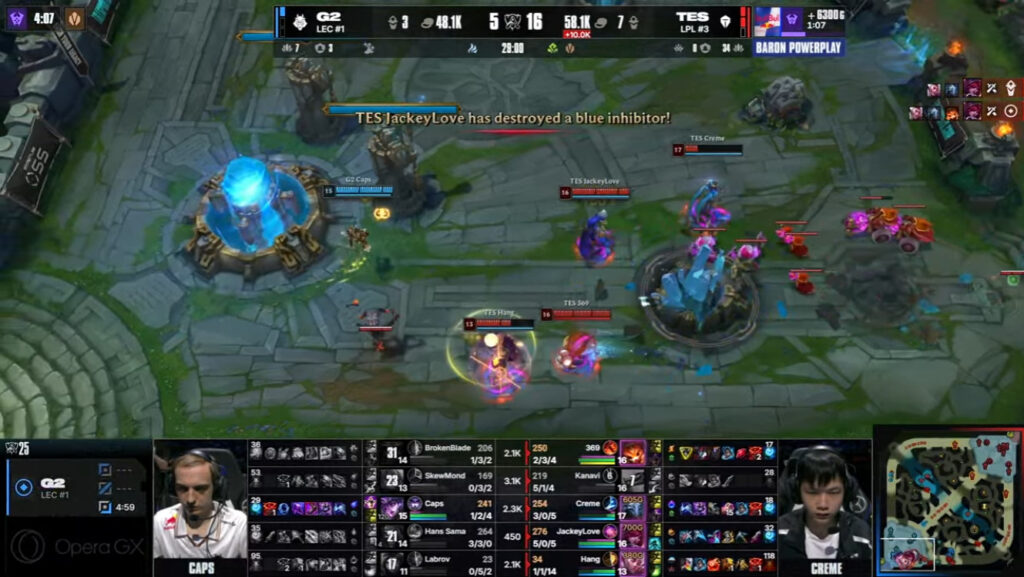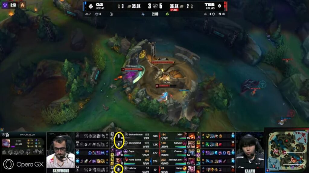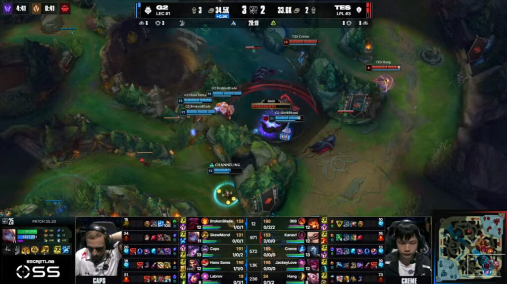試合が大きく動いたのは25分時点。遭遇戦でTESのTOPランブルが落ちて4人対5人になったことを契機にG2はこっそりとバロンをラッシュ。これに気づいたTESが裏から阻害しに行くもののG2の反転を受けて3-0のキルトレードでMIDヨネ以外が落ちる形となり、G2はそのままバロンを奪取します。