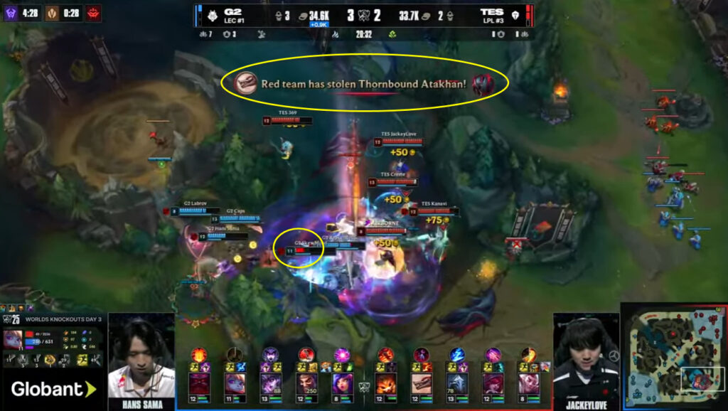 アタカンの体力が徐々に削られていく中、TESがじっくりと圧力をかけてきて最終的にはアタカンのキルはTESのJGナフィーリに奪われてしまいます。また、何とかアタカンを確保しようとギリギリまで粘ったG2のJGポッピーはほぼ瀕死といった状況。G2からすると非常にマズい展開。。。