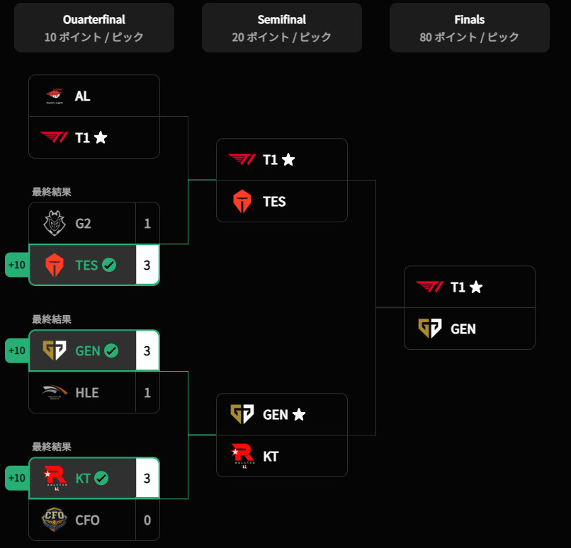 ノックアウトステージは今のところ全て当たっています。ただ、この先はT1に贔屓目に入れていますので、当たると嬉しいところではあるのですが、外れる可能性も高いピッケム、とも言えます。とはいえ、T1が勝って、ピッケムも当たったらそれが最高なので、このピッケムを胸に、T1をしっかり応援したいと思います。