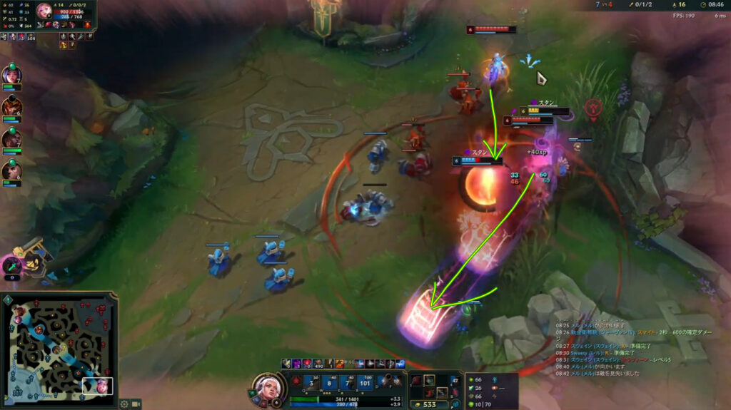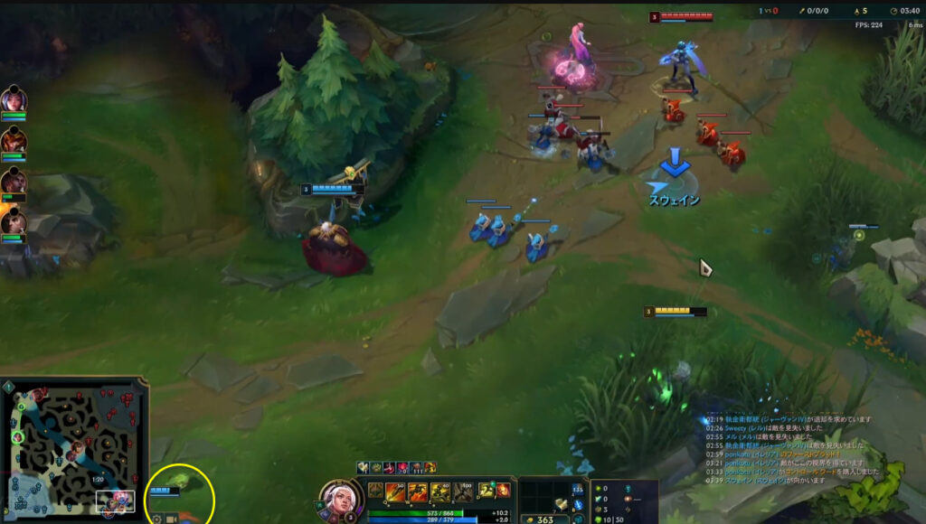 上画像、マップの横に見切れてしまっていますがジャーヴァンがレーンガンクを後ろから狙って来てくれてます。そこにスウェインが「行くぞ!」のPing。これはもう行くしかない。