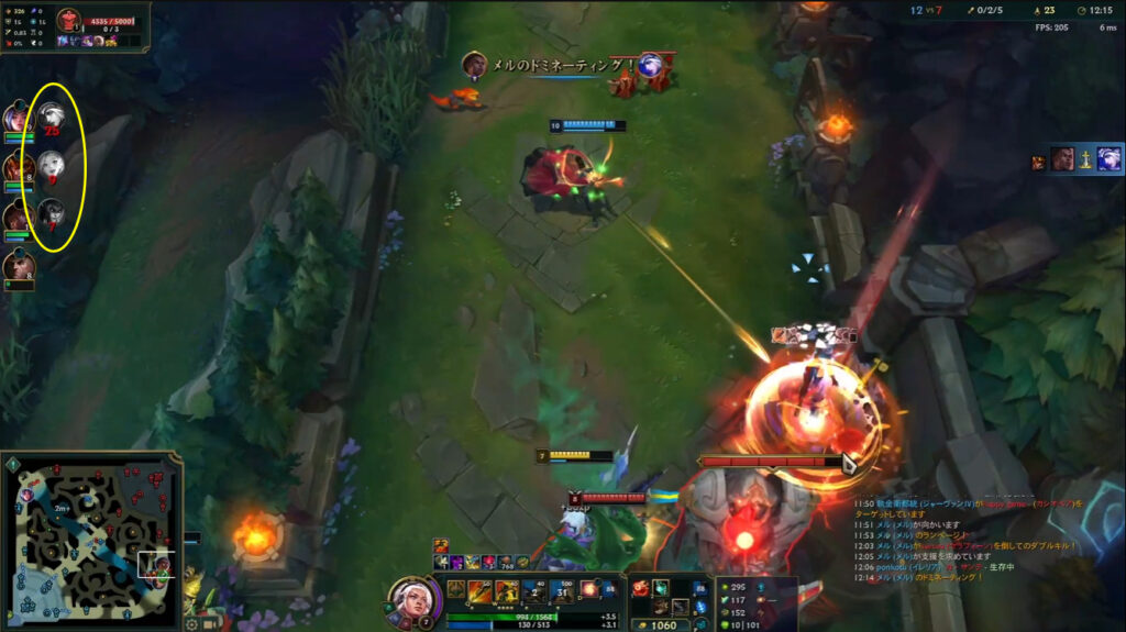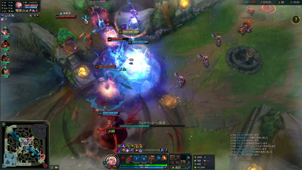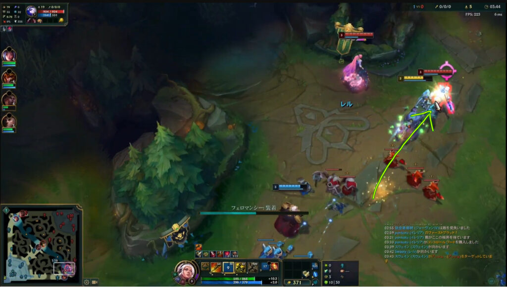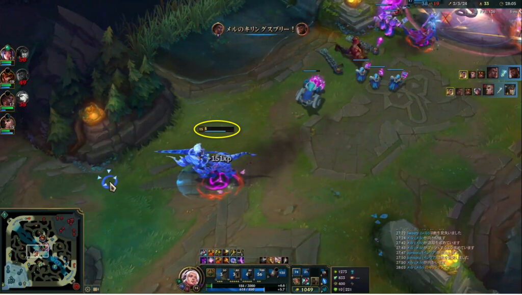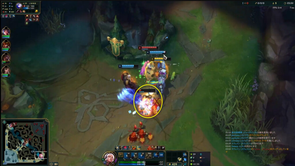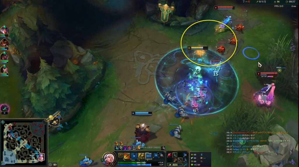 上図は、その一つ前のシーンの続きです。最前線に飛び込んだレルを、やはりタンクとはいえサポなので殺しやすいだろうということで、敵で一番育ったカサンテに執拗に狙われます。が、何とか離脱。こちらは3キルをフリーで獲得しバロンバフもあるのでこのままミッドレーンをシージします。(流石にレルはリコールしました。)