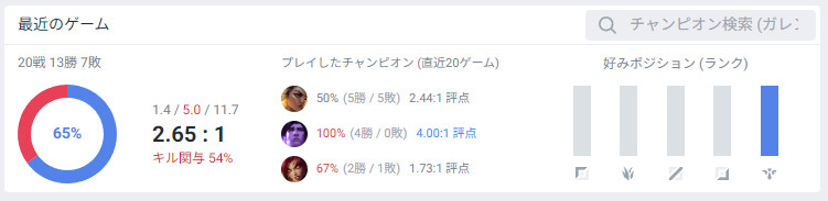 最後に直近の戦績などを。こうしてみるとレル強い強いと感じつつも勝率は50%でタリックの方がLP稼いでくれているんですね。最近は完全ソロしかやっていないので、野良でソロQだとタリックは合わせが難しい印象強いんですが、結果だけ見るともう少しタリックも使っていいのかも。いずれにせよ、この辺りも意識して精進したいと思います。
