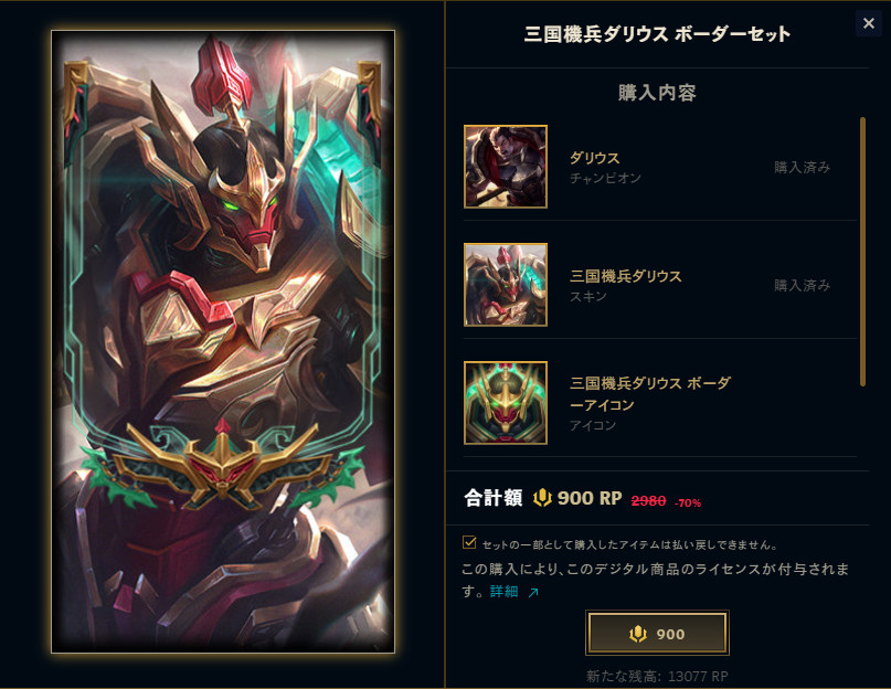 ミシックスキンの場合はアイコンとボーダーのみの追加で550RPで購入可能です。ここ最近は大体こんな感じ。新スキンのなかでレジェンダリー1~2種とミシックを適量、こんな感じでボーダーやアイコン付随でセット売りにしている、という感じで、基本的にはボーダーについてはその後の再販等はない、という認識です。自分は今回のメカメカしいダリウスとウーコンは割と好みだったので両方買ってしまいましたが、この辺りは完全にお好みで。自分のメインチャンプだけ抑えていくのがお財布には優しいと思います。