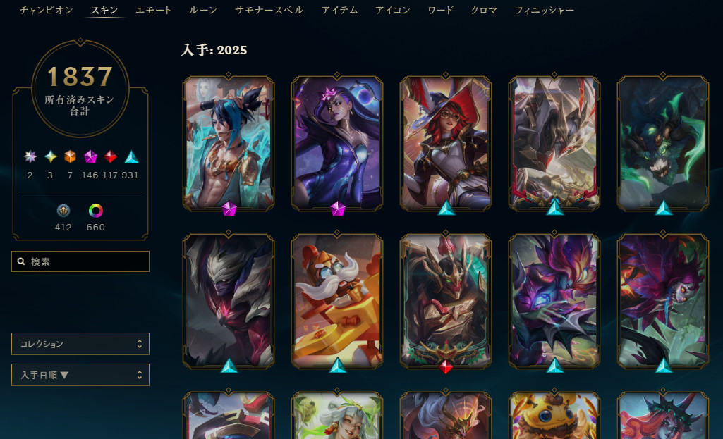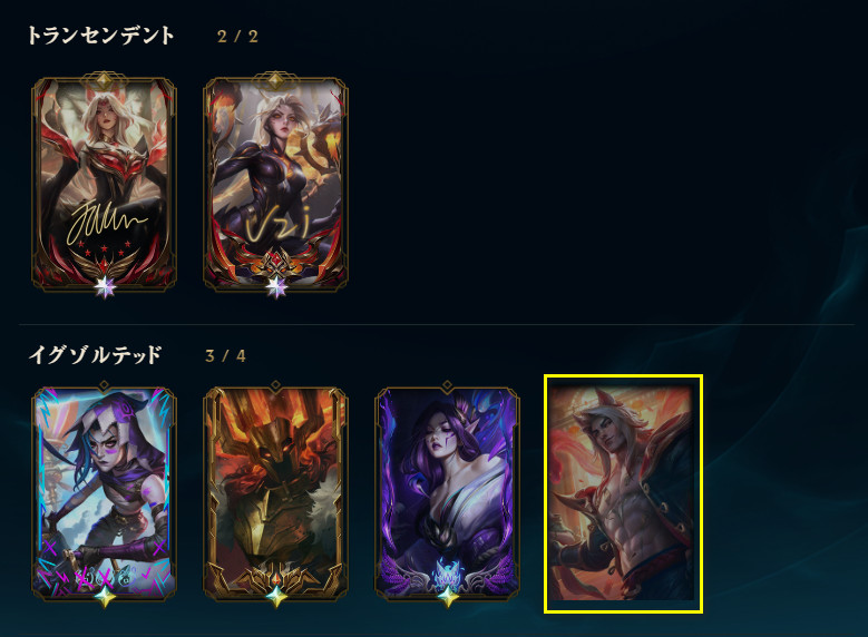 ↑トラセンデントスキンとイグゾルテッドスキンは絶対にかけら合成では出て来ません。まあ、単価が高すぎるのでRIOTとしても出てきてしまうと見合わないということでしょう。ただ、これが出てくるということでみんながカンストするようになれば、それはそれでRIOTは潤うような気もしなくはないのですが、、、まあ、いずれにせよ現状出てこない仕様です。