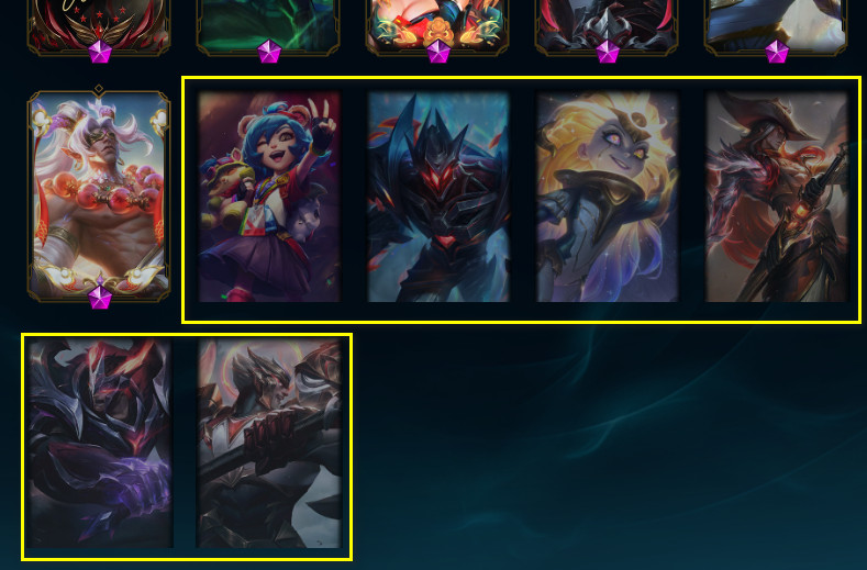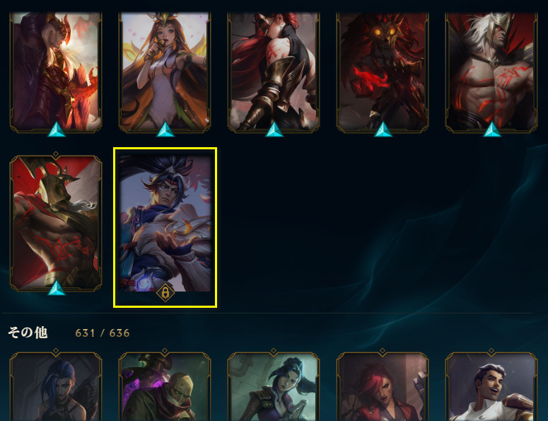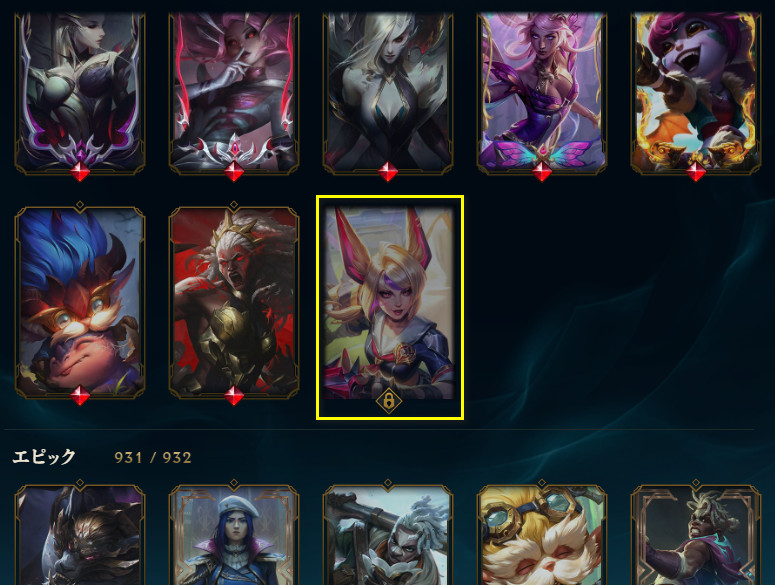 ですので、例えば今回は上の画像のうち8スキンをカプセルから出てきたスキンのかけらで補充したのですが、この8スキンを入手するのにかかった費用は約4800RP、内訳としてミシックスキン×2、レジェンダリースキン×1、エピックスキン×5という内容です。一般的に新スキンはレジェンダリー(1820RP)かエピック(1350RP)なので単価として半分~三分の一のRPで入手可能というのがメリットと言えばメリットです。また、最新のスキンは過去のスキンに比べていずれも出来が良い物が多いので、一度カンストしてしまうとバトルパスや無料チェストも含めると更に安く、最新スキン群を全て手に入れていくことが可能なので、一度カンストまでもっていってしまえば、その後のスキン費用はかなり安価に押さえられる、というのが利点とは言えます。