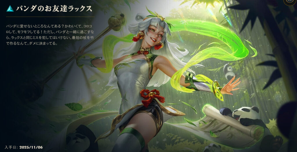 同様の理由で、上図の(今回はこのスキン補充より前に、RPで普通に買ってしまっていたのですが)寄付金を集めるための協賛系のスキンなども、その募金期間はランダム合成の対象に入りません。過去、近しいところで言うとチョガスのミシックスキンやカルマのミシックスキンなどもこうした募金系の括りでした。募金期間が終了したらランダム合成に入ってきますので、入手だけ考えるならば期間終了後にランダム合成をすると簡単ですが、ボーダーまで欲しい場合はしっかりと募金も兼ねて期間中に購入するのが吉、です。私か今回はパンダの柄のボーダーが可愛かったので即買いしてしまいましたが。。。