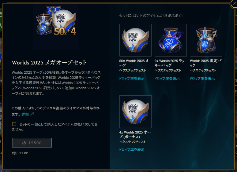 例えば上図、Worldsのメガオーブセットの場合は12500RPでスキンのかけらが確定で先ず54個(カプセル分)出てきます。そしてラッキーバッグ×2と限定パック×1がついてくるため、これがそれぞれ3つのかけらが仮に出たとすると63個のかけらがミニマムでも確定で入手可能です。さらに、カプセルは3.5%の確立でこのラッキーバッグが出ますので、運が良いと3つ位、運が悪くても1つは大体出ますので、ミニマムで1つ追加(かけら×3個)と試算すると66個のかけらが保証されます。
