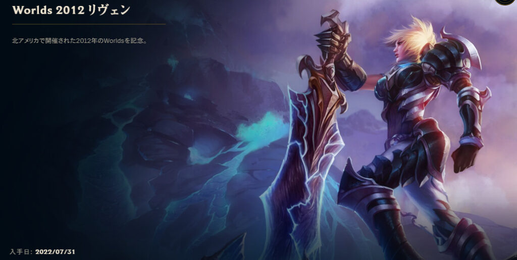 これには2つメリットがあり、一つは全スキンをカンストすると勝利の栄光スキンや一部の本当の限定スキンを除いたスキン群から一点のみ、運営の方に直接連絡することでスキンを送付頂くことが可能です。これは年に5回程度開催されるユアショップでスキンがカンストしていると「ユアショップ欄に何も表示されず、普段からお得意様であるユーザーがユアショップを楽しめない」ことに対する対応措置だとか。(海外の掲示板でそんな記事を拝見して、私も2022年に申請してみたところ、上図の通り2012年のWorlds限定のリヴェンを頂戴しました。復刻版と異なり、頭に小さなティアラを被っています。)
