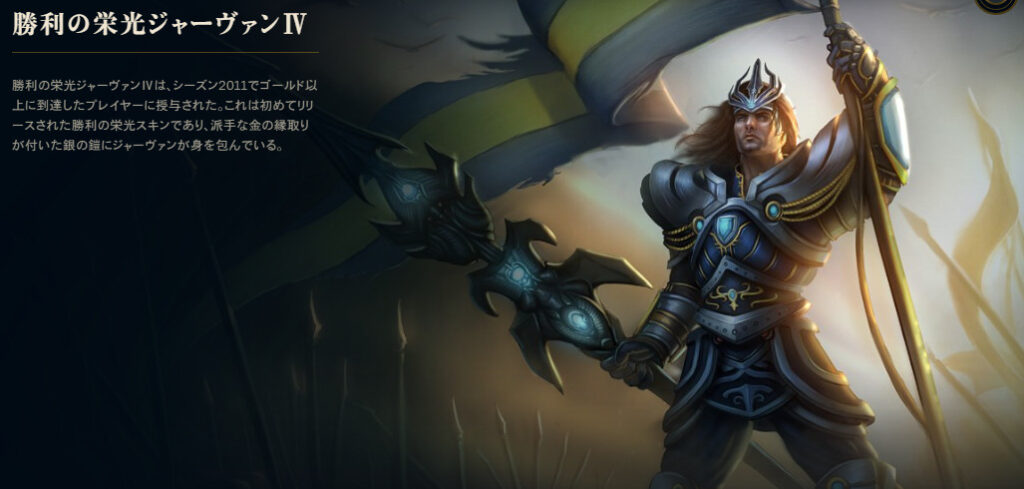 ↑そして最後に、一般スキンからは「勝利の栄光シリーズ」は決してランダム合成からは出てくることはありません。このスキンはランク戦を頑張った人への報酬スキンなので、これが出てこないのは、まあ当然というか妥当な感はありますね。私はファーストシーズンのジャーヴァンIVをたまたま保有しているのですが、今思えばジャンナやグレイブス、エリスやモルガナも欲しかったなぁ、、、なんて思ってしまいます。