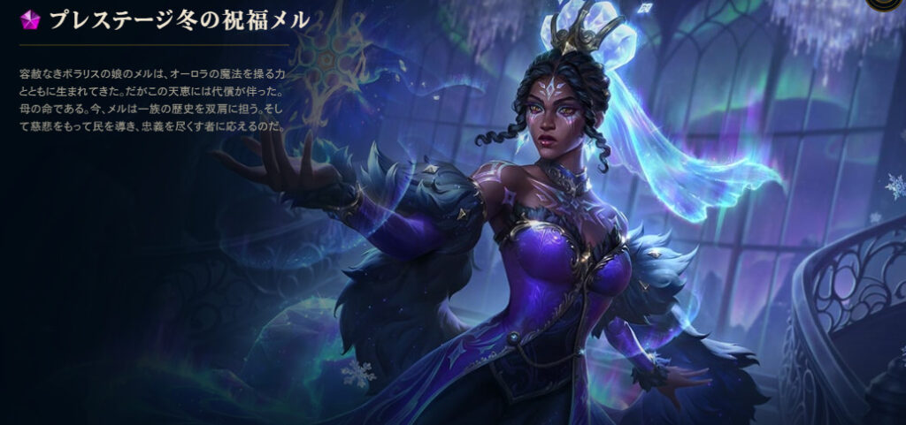 ↑ちなみにメルはスプラッシュアートやアイコンは好みではないのですが、ゲーム内の造りは結構好きです。上図に出ているビビットクロマ(35ミシックエッセンスで同時購入可能)の方も、もともとのメル以上にゴージャスさと華やかさを感じられる配色でこっちは結構好み。
