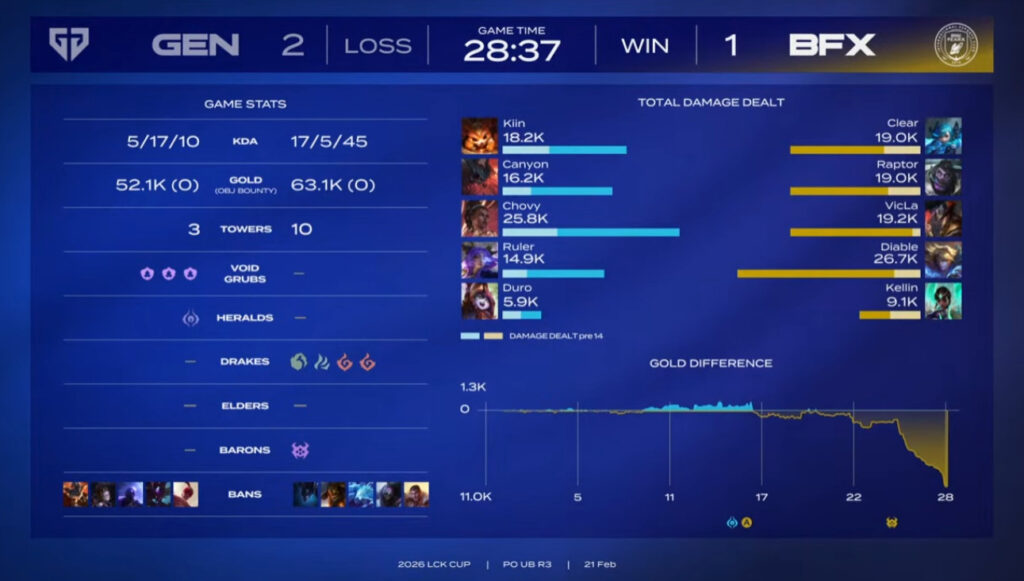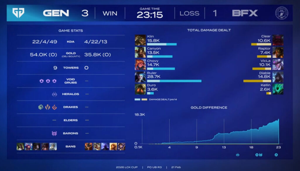 こちらは勝利したBFXはしっかりADCがダメージを出しており、負けたGEN側はMIDが暴れた痕跡はありつつも、ADCが上手く機能できずに負けたような印象も。ドラも全て押さえられてしまっていますしね。。。