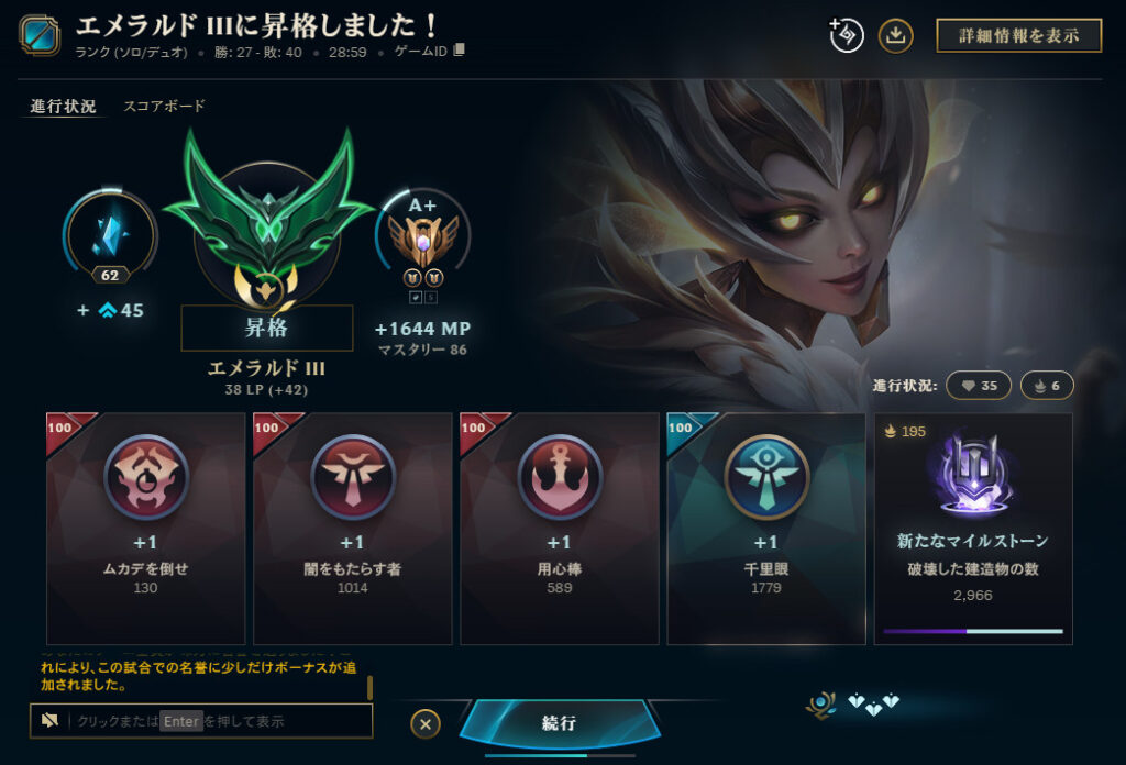 記事を思ったより短時間で書き終わったので本当に久しぶりにソロQ行ってみたらメインロールで「武勇のイージス」頂けました。これってどこでもオプションになった時に保険的に適用されるだけだと思っていたのですが、メインロールでもこうしてたまに倍LPもらえたりするんですね。初めての経験だったのでちょっと驚きました。
